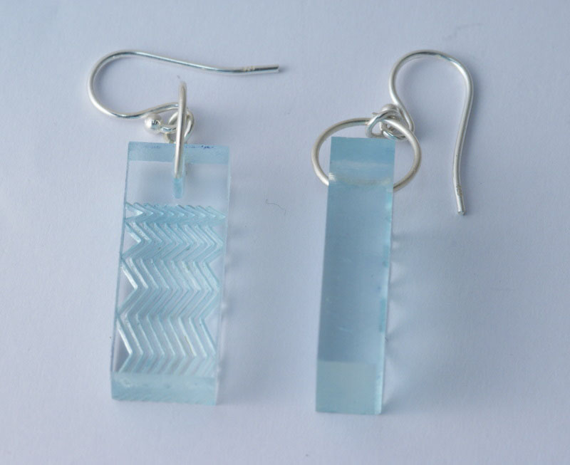 The acrylic was then dyed and the earrings hung on silver findings from Cooksons. One of the good points of these earrings is that they are very lightweight and the engraved finish catches the light nicely.