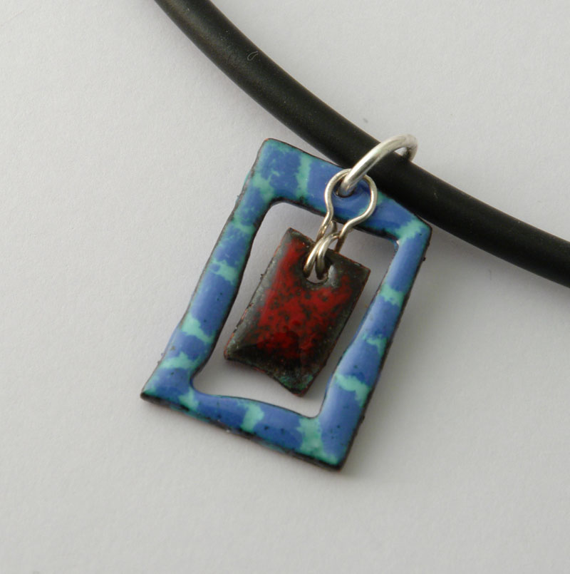 Having made a friend a small phone charm, I used some of the left over bits of copper and enamelled them to form a small pendant. The blue pattern is made by firing the turquoise layer, sifting blue enamel over the piece and scratching through the power with a stick.