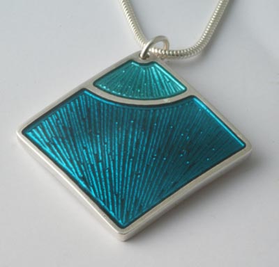 The engraving pattern was quite different to the previous pendants we had produced and we hoped it would produce a sparkle underneath the transparent enamel. The finished product does have a lovely depth to it although the two enamels used (Soyer 46 (green turquoise)for the top and 103 (deep turquoise) for the bottom) turned out to be a bit closer in colour than I had realised.