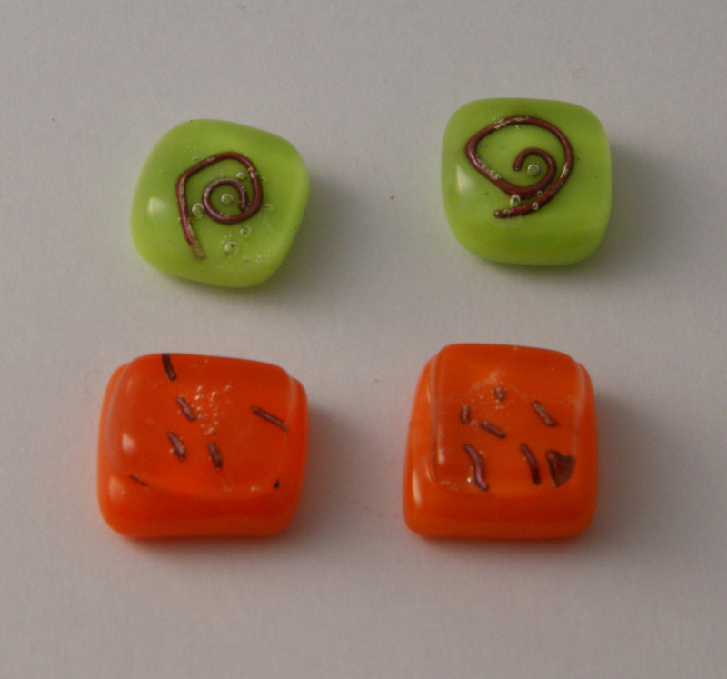 These were made using small pieces of copper wire from electrical cable sandwiched between coloured and clear glass - it oxidises to a lovely red colour. The orange pair are underfired - the small kiln we use does not get hot enough at the front - lesson learnt!