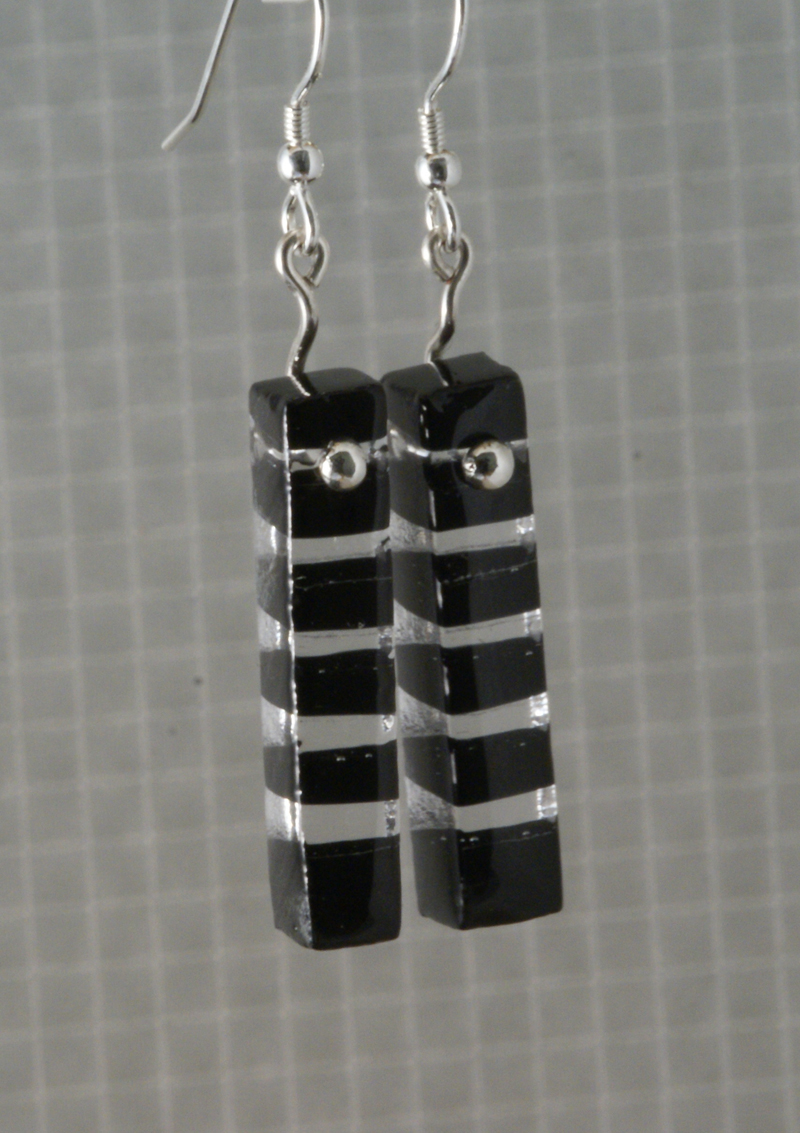 In this case strips of black and clear glass were fused together and then cut using a diamond saw. Luckily the piece was big enough to allow for a couple of breakages! The strips were then drilled and fire polished before hanging on silver earrings as shown.