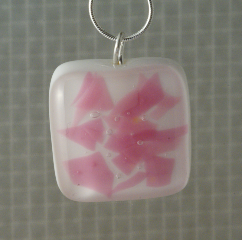 The original pendant I made for her used one of the free samples of dichroic glass which WarmGlass send with their packages of glass. In the light it flashed purple/pink and looked lovely on the white glass - however this effect almost disappeared in daylight after firing. Whilst it would make a great pendant for a bridesmaid, for a girl who liked 'pink' I didn't feel that it would make the grade - hence the previous pendant.