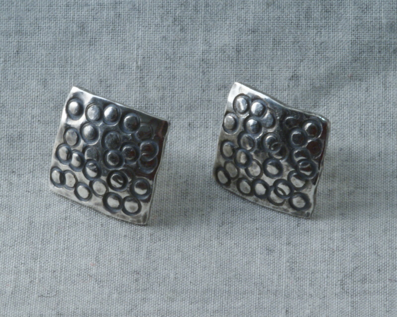 A round punch was used to mark circles on 1mm thick squares of sterling silver. The square was then domed slightly before being soldered on to earring pins. After pickling the earrings were oxidised using liver of sulphur. Excess oxidation was removed using a dremel felt and finally the earrings were burnished to bring out the highlights in the silver texture.