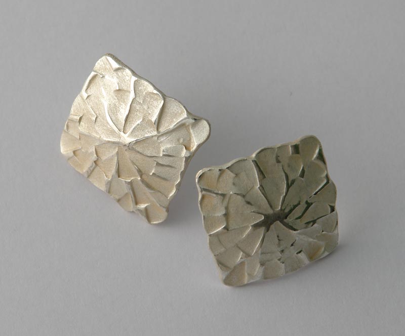 These earrings are made of squares of fine silver which has been punched and then slightly domed. A silver ear post is soldered on the back. The back of the earring and the post are painted with black lacquer and the earring is then etched in ferric nitrate (the lacquer protects the pin from being etched away). After cleaning off the lacquer, the front/edges of the earring are burnished to a high polish.
