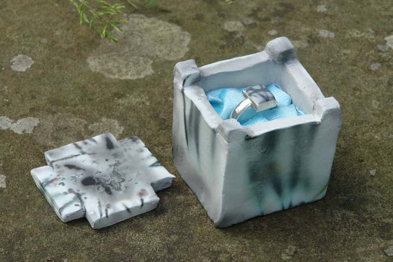 It was only a matter of time before we moved from making small boxes to small pieces which could be set as stones in rings ... and here is the result. The surface finish is quite fragile and so the ring is not that practical - it was more a case of my desire to merge both ceramics and silversmithing in one item, and to see what emerged.