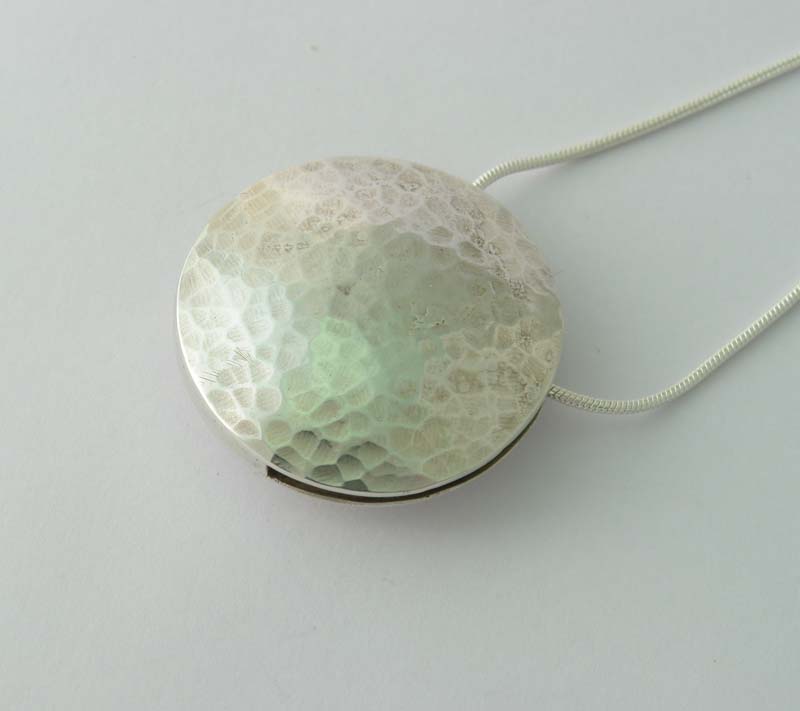 One side of the pendant was textured with a ball pein hammer. The other side was etched with a design. The finished pendant was suspended on a silver snake chain from Cooksons.